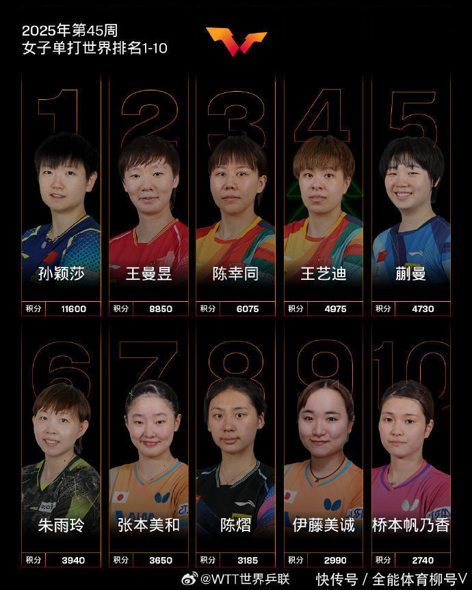 蒙彼利埃国锦赛扫尾后,海外乒联2025年第45周寰宇名次火热出炉。女子单打方面,中国队共有6名选手高居前10,更相宜包揽了前5,具体名次为,孙颖莎、王曼昱、陈幸同、王艺迪、蒯曼包揽前5,小将陈熠排在第8。